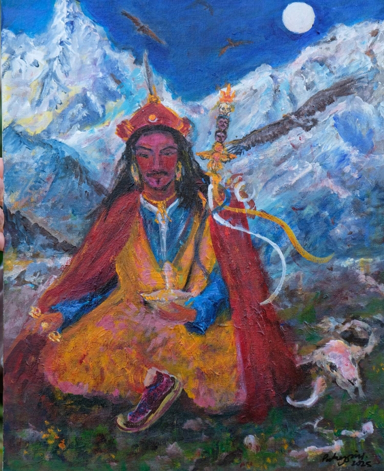 Padmasambhav, Guru Rimpoche is a figure, an enlightened being, that I have had the great good fortune to be connected too for nearly 30 years. Traditionally he has 8 main forms, the form that I have painted him in is his Guru, teacher form. And for me, it’s been an important part of my creative practice to have a human dimension to his appearance.